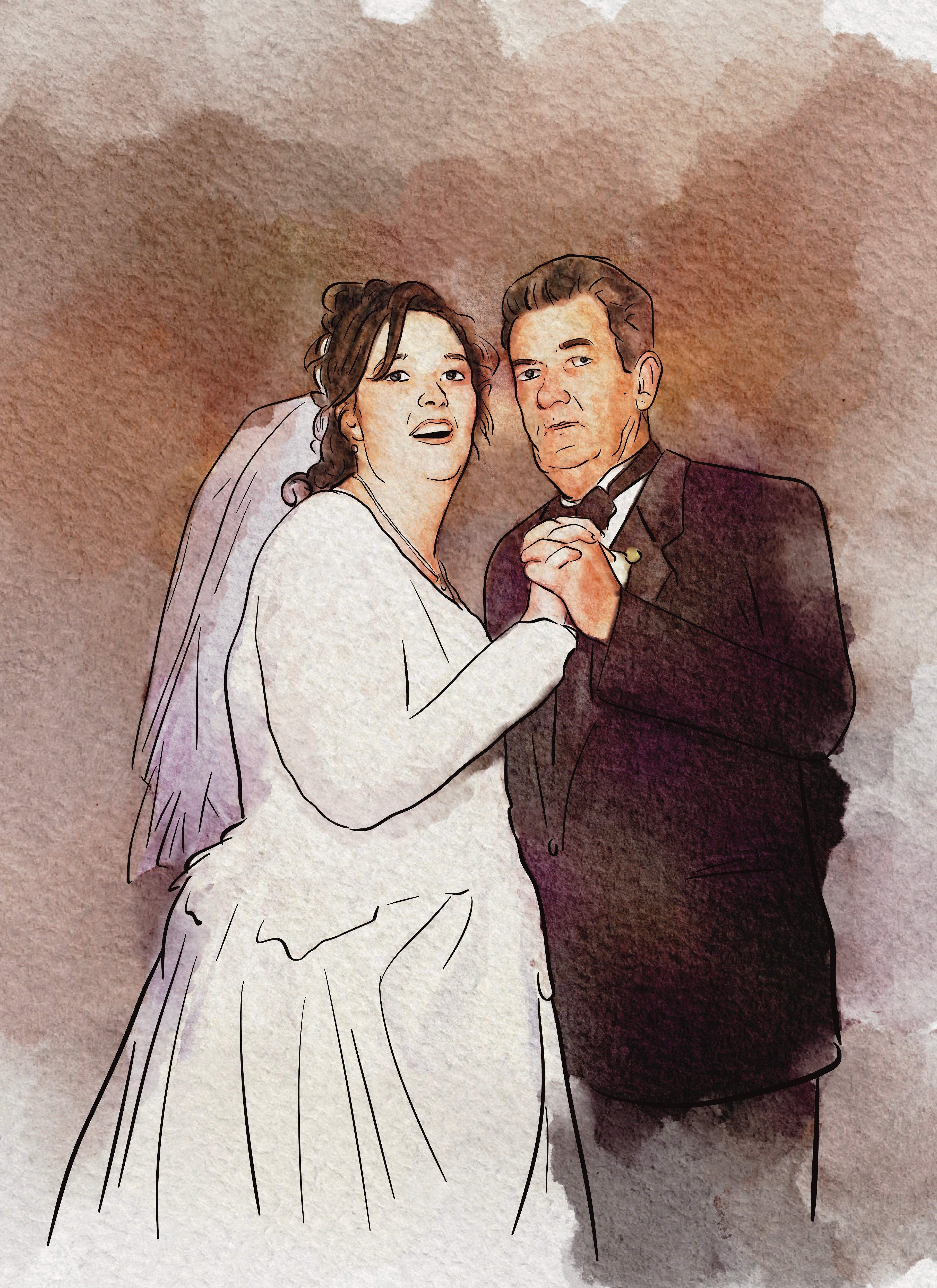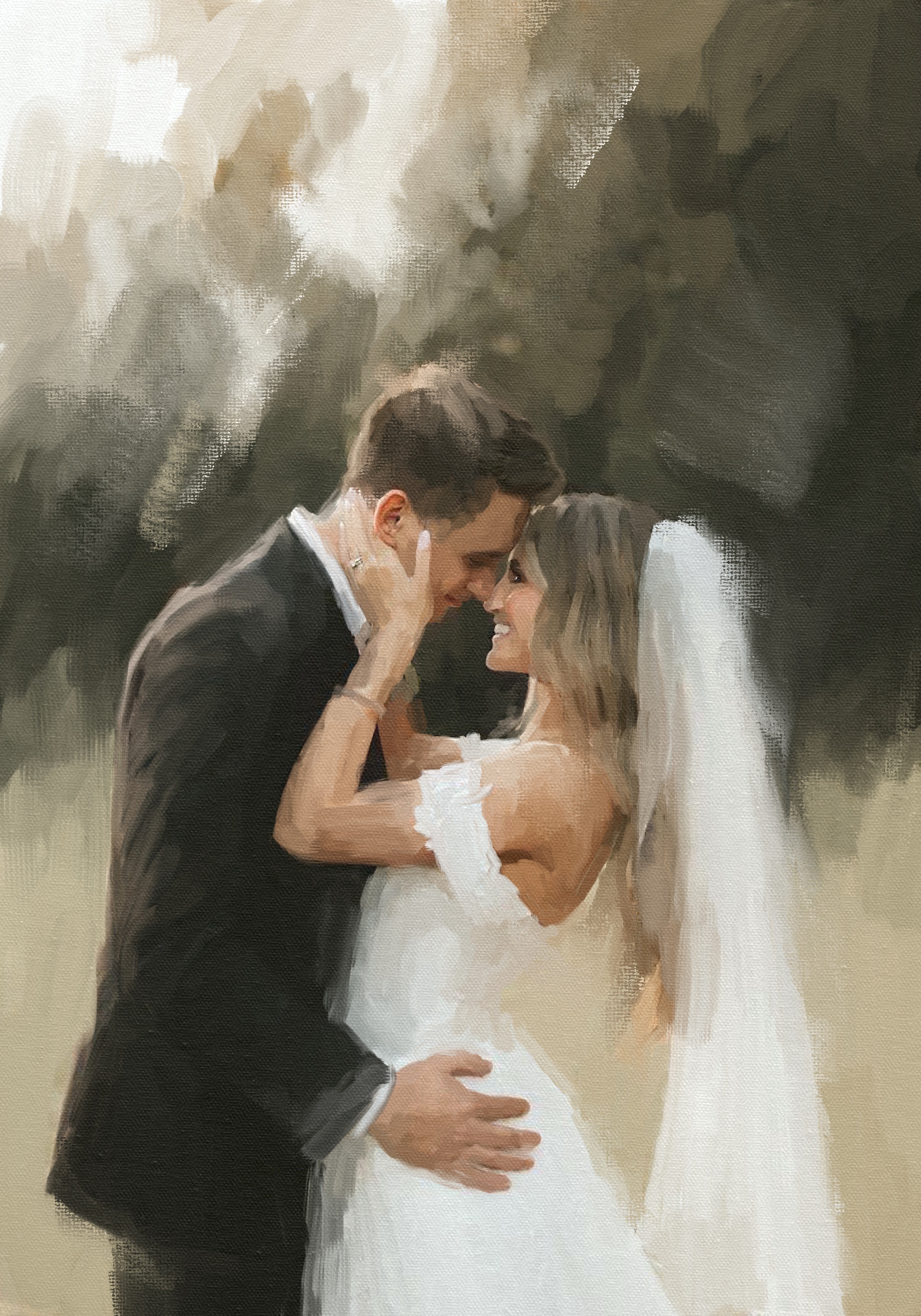 Each piece starts with your photo or inspiration: your wedding day, a candid shot, a favorite vacation or the place where you first met. We turn it into a museum-quality painting — available in watercolor or oil — that reflects your love and style.